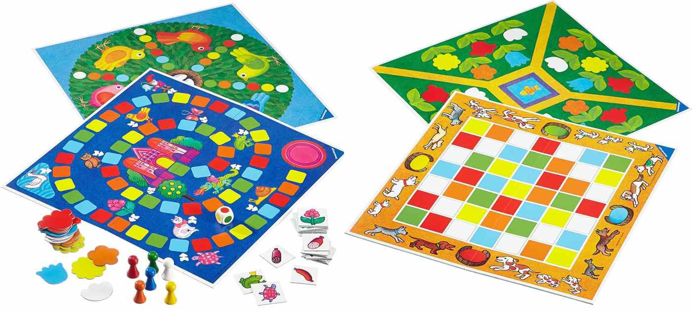 Die Spielesammlung für Kleinkinder ist ein zeitloser Klassiker. Mit seinem dicken, griffigen Spielmaterial geht sie gezielt auf die Fähigkeiten und Bedürfnisse von Kleinkindern sowie Vorschulkindern ein. Farben kennenlernen, Zählen üben, Bilder merken – die Spielsammlung bietet reichlich Abwechslung. Wurstschnappen, Blumen würfeln, das Vogelspiel und das Spiel mit dem Schloss bringen jede Menge Spielspaß auf den Spieltisch. Hier kommt die komplette Familie auf ihre Kosten. Einige der Spiele kann man mit unterschiedlichem Schwierigkeitsgrad spielen, denn so „wächst“ die Sammlung mit eurem Kind mit. Sie bringt über mehrere Jahre hinweg ungetrübte Spielfreude. Die Spielpackung übersteht problemlos mehrere Generationen. Das Material ist hervorragend verarbeitet und dadurch besonders langlebig. Falls ihr die Spielanleitung verlegt oder verloren habt, könnt ihr sie euch hier kostenlos als PDF-Datei herunterladen.