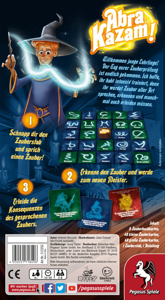 Das Kartenspiel Abra Kazam von Pegasus Spiele sorgen auf eine magische Art und Weise für Lachtränen und jede Menge Spaß in der Gruppe. Hier geht es hoch her im Zauberkunst-Unterricht mit dem Zauberstab. Es werden verschiedene Sprüche vorgeführt, für die man eine bestimmte Geste ausführen muss. Die restlichen Spieler erraten um welchen Spruch es sich handelt. Der es am schnellsten geschafft hat wird zum Magier und darf seinen Zauber vorführen. Gewonnen hat dann der Magier mit den meisten Zauberkarten.