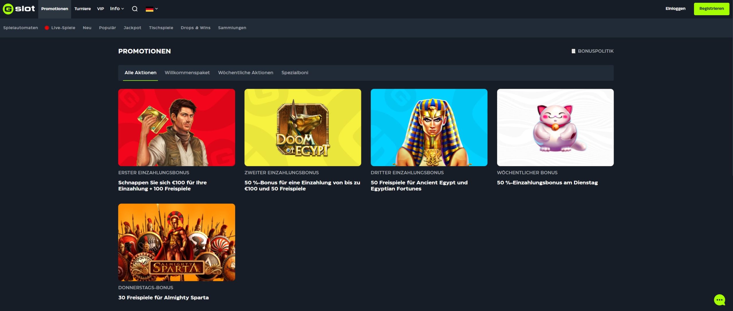 Hier hören die Boni von Gslot aber noch nicht auf. Du kannst außerdem zwei Reload Boni nutzen. Jeden Dienstag erhältst du mit dem Code „G2“ einen Bonus von 50 % auf deine Einzahlung, der maximale Bonusbetrag beträgt 100 €. Auch am Donnerstag kannst du dir einen Reload Bonus von 30 Freispielen für Almighty Sparta Dice sichern.