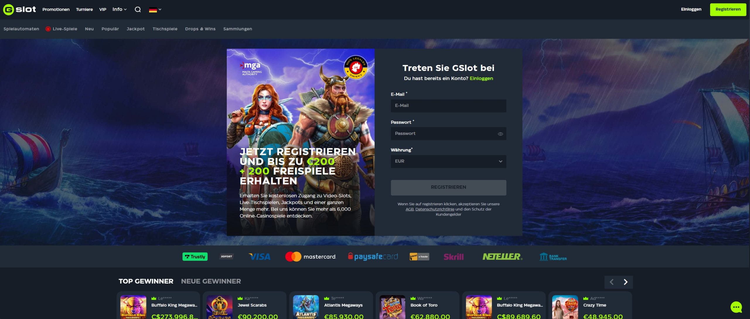 Solltest du dich entscheiden, bei Gslot anzumelden, dann hast du die Möglichkeit, einen Willkommensbonus von bis zu 200 € und 200 Freispielen zu erhalten. Außerdem gibt es noch zwei Reload Boni die du während der Woche aktivieren kannst. Solltest du also deinen Account registrieren, dann erhältst du auf deine ersten drei Einzahlungen einen Bonus von bis zu 200 € und 200 Freispielen.