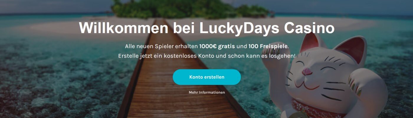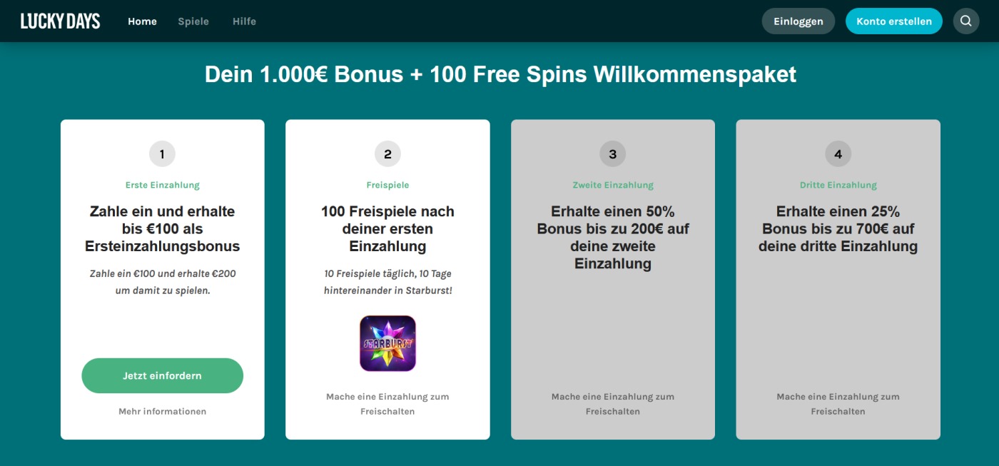 Der komplette Willkommensbonus bis zu 1000 € erstreckt sich bei Lucky Days über die ersten drei Einzahlungen. Als zusätzliches Dankeschön erhalten Sie 100 Freispiele, die zehn Tage in Folge in 10er Blöcken vergeben werden. Sie müssen Sie lediglich täglich in Ihrem Account freischalten.