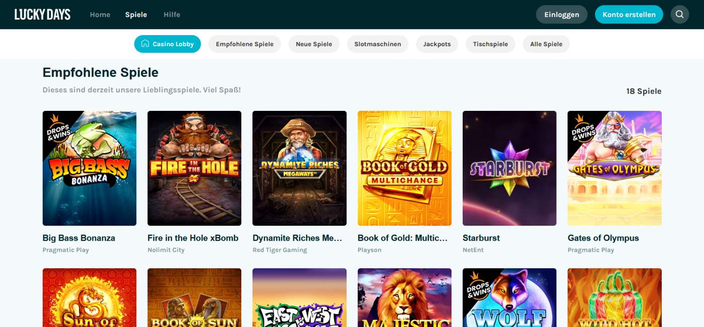 Bei Lucky Days können Sie knapp 2100 Slotautomaten der besten Hersteller spielen. Im Angebot sind beispielsweise Spielautomaten von iSoftBet, Betsoft, Playson oder Pragmatic Play. Es sind aber auch viele neuere Provider vertreten, welche die Software für ihre neuesten Titel bei LuckyDays bereitstellen. Wer nicht nur die Nr.1-Slots spielen will, findet hier viele gute Anregungen. Außerdem wird das Angebot ständig durch die neuesten Veröffentlichungen in der Branche erweitert und man darf sich immer wieder auf top Neuerscheinungen freuen.