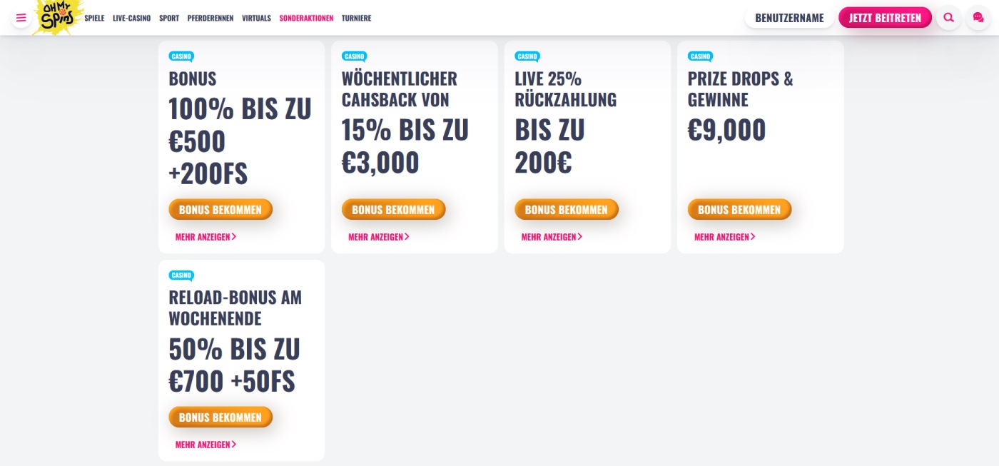 Vor allem neue Spieler können sich hier über einen Bonus freuen. Für Bestandskunden hält OhMySpins ebenfalls immer wieder sehr gute Bonusangebote bereit. Wenn sich der Spieler hier registriert, kann dieser sich den Willkommensbonus mit einem Guthaben von bis zu 500 Euro inklusive der 200 Freispiele sichern. Mit der Mindesteinzahlung von leidlich 20 Euro holt dieser sich 100 Prozent Extraguthaben und Freispiele auf das Konto. Die Gratisspiele sind dann 10 Tage in Folge immer zu 20 Stück nutzbar und der Spieler muss diese lediglich in dem Konto aktivieren. Dabei können die ersten Freispiele direkt nach Ersteinzahlung für insgesamt 24 Stunden beansprucht werden, weitere werden nach nochmaligen 24 Stunden im Konto gebucht.
