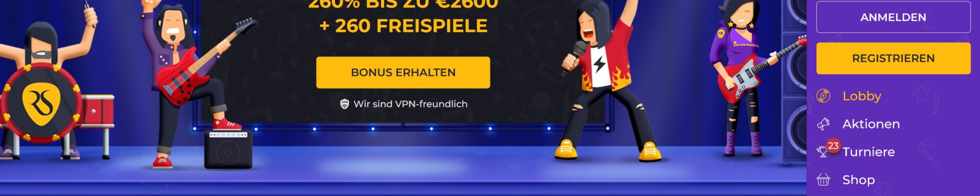 Die Registrierung bei RollingSlots ist ein Kinderspiel und in Kürze erledigt. Es steht für Sie einer vier ‚Helden‘ zur Auswahl: Der Bassist Lenny, Leadgitarristin Ellie, Drummer Joe und Sänger Mickey. In wessen Rolle wollen Sie Ihr rockiges Slotabenteuer starten? Die Wahl beeinflusst nicht das spätere Spielgeschehen und ist lediglich ein kleiner Gag.