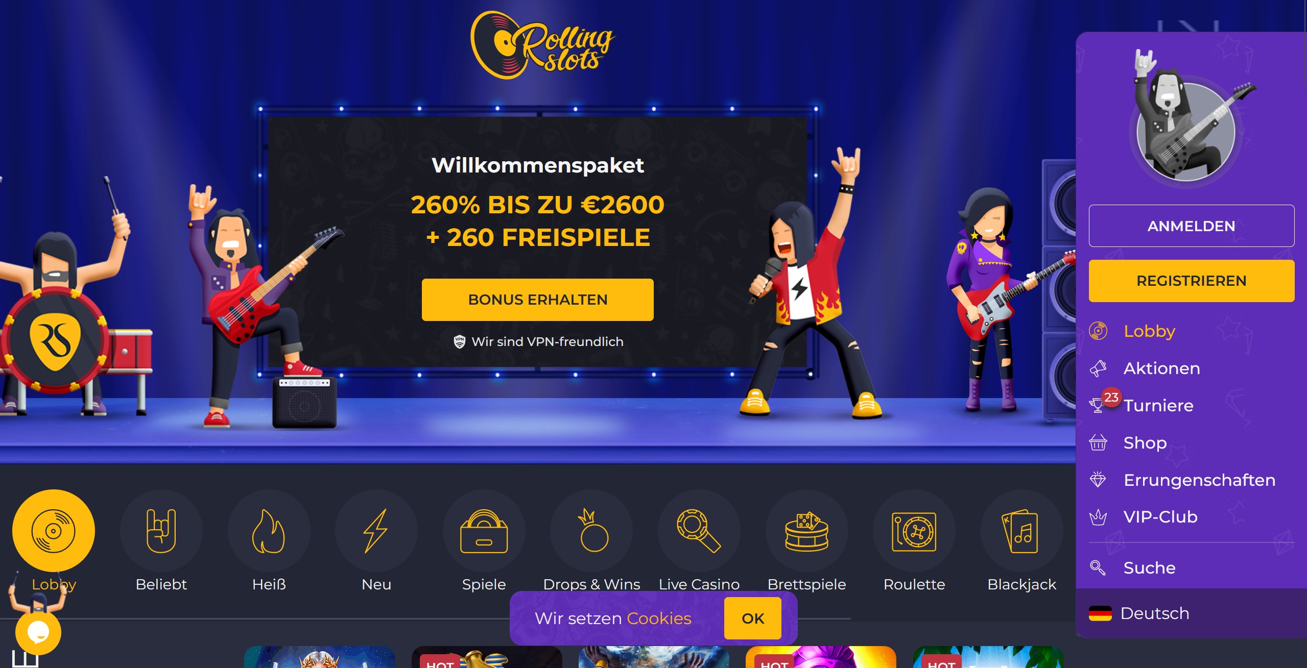 Das RollingSlots Online Casino hat einen grandiosen Start hingelegt. Casino-Spiele sind in voller Bandbreite vorhanden und bieten langfristig abwechslungsreichen Spielspaß. Das Design der Webseite ist ganz nett, allerdings nicht jedermanns Sache. Freunden des gepflegten Classic-Rock dürfte es aber gefallen. Die Registrierung ist so einfach wie möglich gehalten, um Neukunden einen schnellen Zugang zu allen Casino-Games zu ermöglichen. Die Spiele können fast alle kostenlos als Demo gespielt werden.