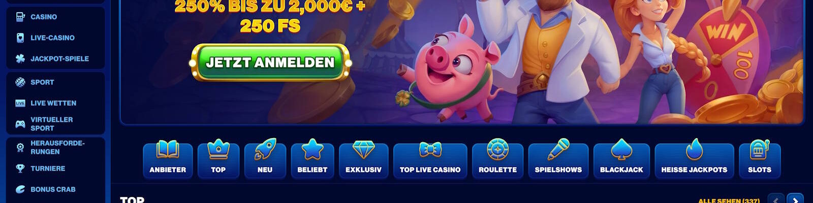 250% bis 2000€ Willkommensbonus + 250 Freispiele + 1 Bonus Crab
