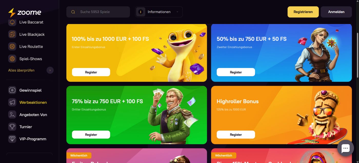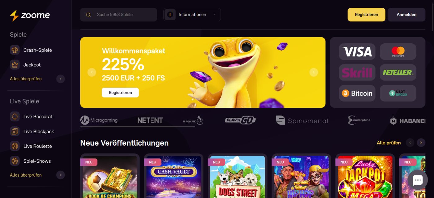 Das noch sehr junge Zoome Casino hat definitiv Potential. Es versorgt euch mit mehr als 5.300 Spielen. Davon entfällt ein guter Teil auf das Live Casino mit echten Dealern. Dutzende von Jackpot ergänzen das Angebot.