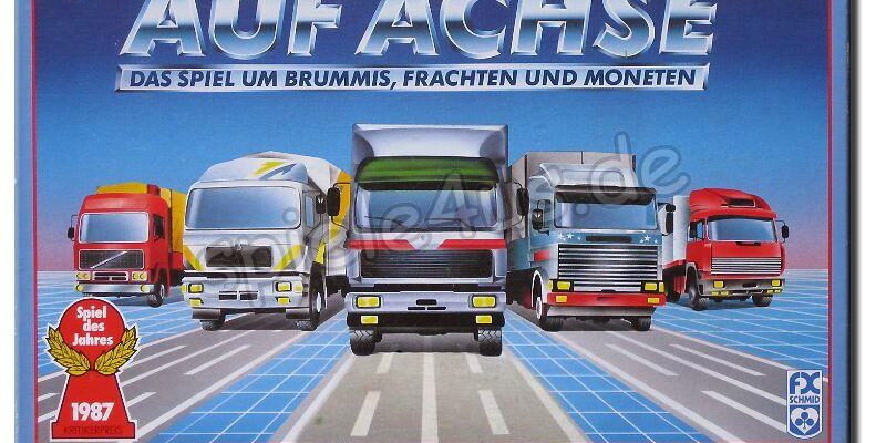 Bei dem Brettspiel Auf Achse übernimmt man die Rolle von einem Spediteur, der mit seinem LKW kreuz und quer durch Mitteleuropa fährt. Hierbei ist es wichtig, möglichst viele lukrative Aufträge zu bekommen und sinnvolle Routen auszuarbeiten. Denn nur dann kann man die Aufträge auch gewinnbringend ausführen. Gewonnen hat nachher der Spieler mit dem meisten Geld.