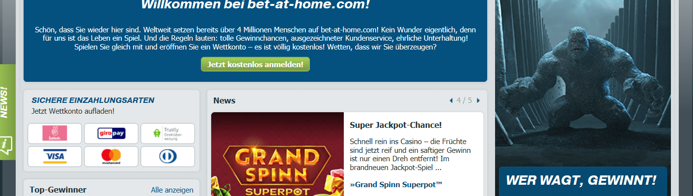 bet-at-home ist ein Wettanbieter von Sportwetten, welcher europaweit bekannt ist. Mit 5 Millionen registrierten Kunden und mittlerweile 30 Jahren Erfahrung im Geschäft der Sportwetten ist der Buchmacher einer, der weiß was seine Kunden wollen. Durch die Bekanntschaft in ganz Europa ist das Angebot mittlerweile in 11 Sprachen übersetzt worden.