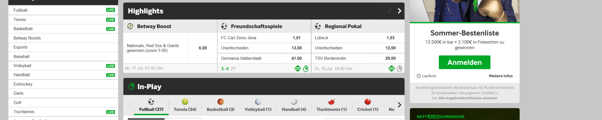 Bei dem Wettangebot kann sich Betway richtig beweisen. Insgesamt gibt es 32 verschiedene Kategorien. Natürlich sind hier die bekanntesten vertreten wie Fußball, Basketball, American Football und so weiter. Aber auch außergewöhnliche Sportarten finden hier Platz. Seid ihr Fans von Wasserball, Tischtennis oder Schwimmen? Dann werdet ihr hier auch fündig.