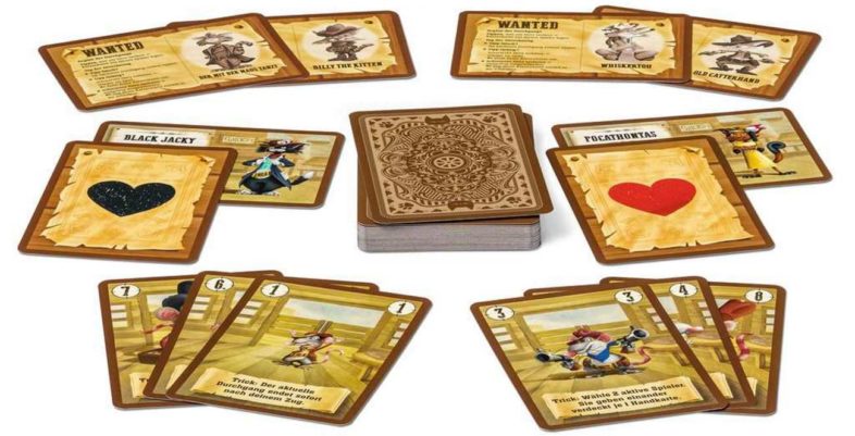 Zunächst darf jeder Spieler eine der Katzenkarten auswählen. Diese legt ihr mit der Saloonseite nach oben vor euch. Anschließend erhält jeder 3 Herzkarten und legt sie mit dem roten Herz nach oben vor sich. Achtung: Bei 4 und mehr Spielern erhält jeder nur 2 Herzkarten. Die „+1“-Karte legt ihr griffbereit auf den Tisch. Herzkarten und Katzenkarten, welche nicht benötigt werden, legt ihr zur Seite, denn sie werden nicht benötigt.