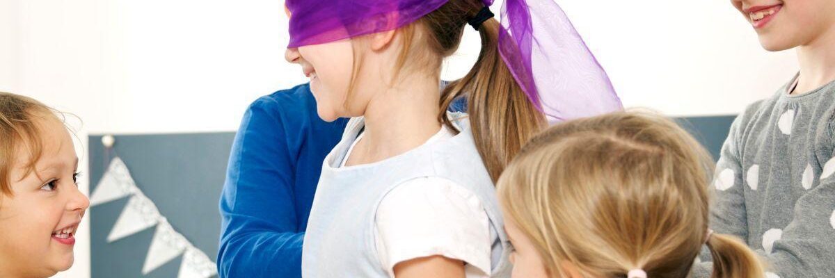 Stellen Sie sicher, dass der Bereich, in dem das Spiel stattfinden wird, sicher und frei von scharfen Ecken oder Gegenständen ist. Der Spieler, der die „Blinde Kuh“ sein wird, bekommt die Augen verbunden.