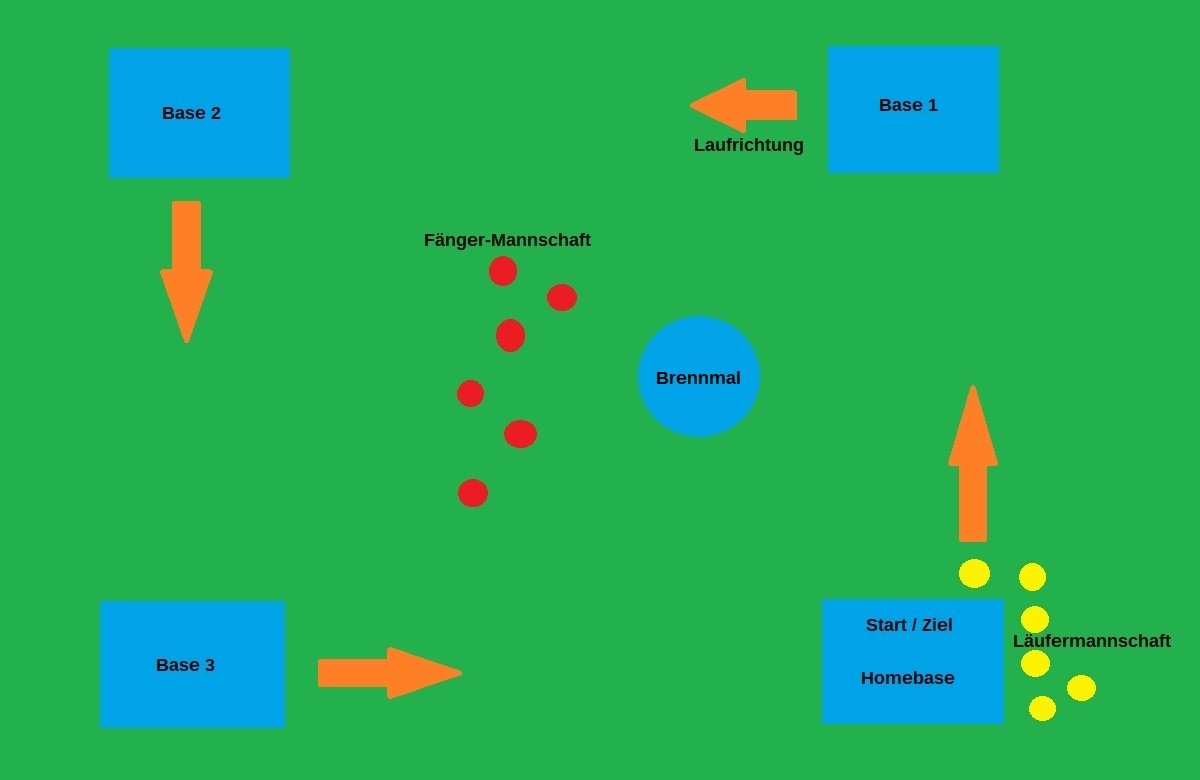 Die Läufermannschaft stellt sich am Startpunkt auf, die Fänger verteilen sich im Spielfeld. Nun wirft einer der Läufer den Ball in Richtung einer freien Stelle im Spielfeld. Während die Fänger den Ball einfangen bzw. holen und ihn Richtung Brenner werfen, starter der Läufer (siehe Abb. Laufrichtung) und versucht die erste Basis zu erreichen. Solange der geworfene Ball nicht im Brennmal aufprallt, kann der Läufer die Bases der Reihenfolge nach anlaufen. Sobald der Ball im Brennmal landet, muss der Läufer sicher in einer Base stehen. Ist er außerhalb, scheidet aus dem Spiel aus.