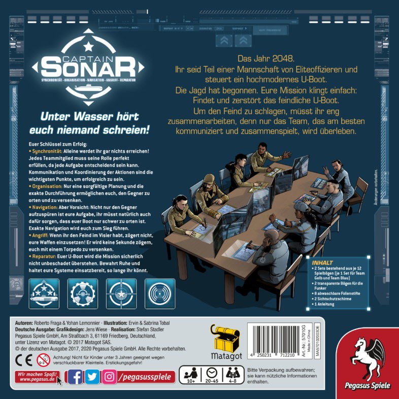 Das Strategiespiel Captain Sonar von Pegasus Spiele kann bis zu acht Personen gespielt werden und ist daher super geeignet für große Spielrunden. Die verschiedenen Elemente werden im Echtzeitmodus gespielt. Bei der „Operation Drache“ werden unbekannte Gewässer erforscht mit vielen aufregenden Abenteuern. Zwar kann man die sieben Missionen in beliebiger Reihenfolge spielen, es empfiehlt sich aber dies in der angegebenen Reihenfolge zu tun und immer mit der gleichen Besetzung zu spielen.