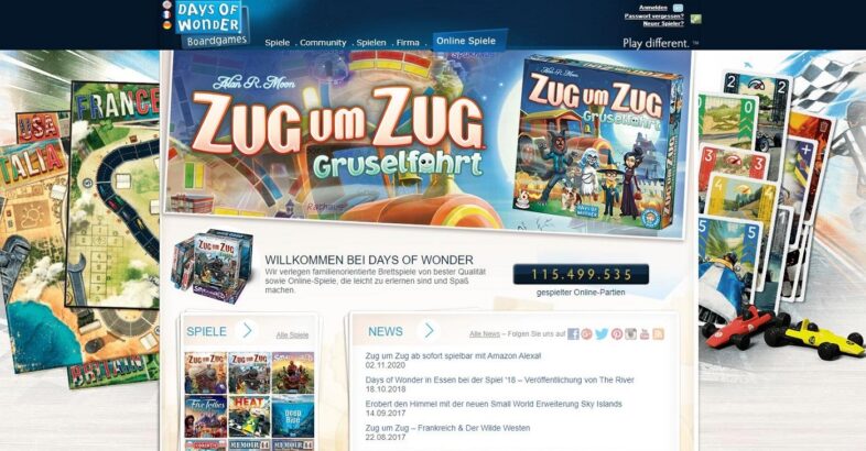 „Play different“, also „Anders spielen“ heißt der Slogan des Spieleentwicklers und Produzent Days of Wonder , kurz DoW. Es ist ein Verlag für Brett-, Karten- und Onlinespiele, welche mittlerweile in 40 Ländern vertrieben werden. Die Gründung erfolgte am 01.10.2002 und dabei wurden Spiele in über 25 Nationen veröffentlicht.