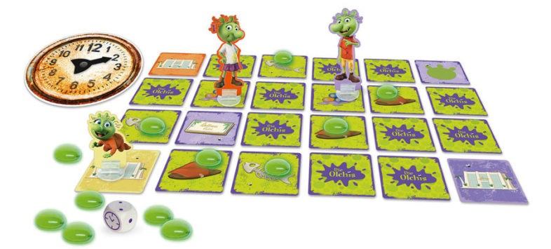 Bei dem Kartenspiel Die Olchis von Schmidt Spiele muss man ganz schön zusammen halten. Dort gibt es käsige Stinke Socken und die Aufgabe ist es, dass Schmuddelfing etwas besser riechen soll. Bis 12 Uhr haben die Olchis um den Geruch los zu werden. Denn danach beginnt die Bürgerversammlung und da wird einiges wichtiges entschieden. Reihum wird durch würfeln die Karten aufgedeckt und kommen drei gleiche zum Vorschein, dann darf man sie einsammeln. Erwischt man einen Gutschein für Wellness, dann muss man in die Wanne und das ist nicht nur ekelig sondern kostet auch viel Zeit.
