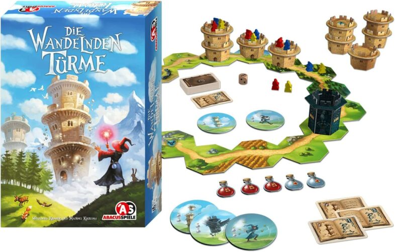 Von den Abacusspielen gibt es „Die wandelnden Türme„. Es spielen zwei bis sechs Spieler als Magier, sind auf dem Weg zur schwarzen Rabenburg und ziehen über die Türme und Felder hinweg. Gewonnen hat der Spieler, der die Burg erreicht hat und seine ganzen Zaubertrankflaschen aufgefüllt hat. Das Spiel geht sehr dynamisch zu. Es kommt vor, dass die eigenen Magier in den Türmen eingesperrt werden, da ist es wichtig, sich zu behalten, wo gerade sein Magier feststeckt.