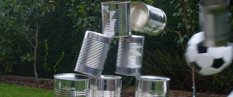 Leere Blechdosen sind ideal, da sie robust sind und beim Umwerfen ein schönes Geräusch machen. Wichtig ist, dass sie keine scharfen Kanten haben.