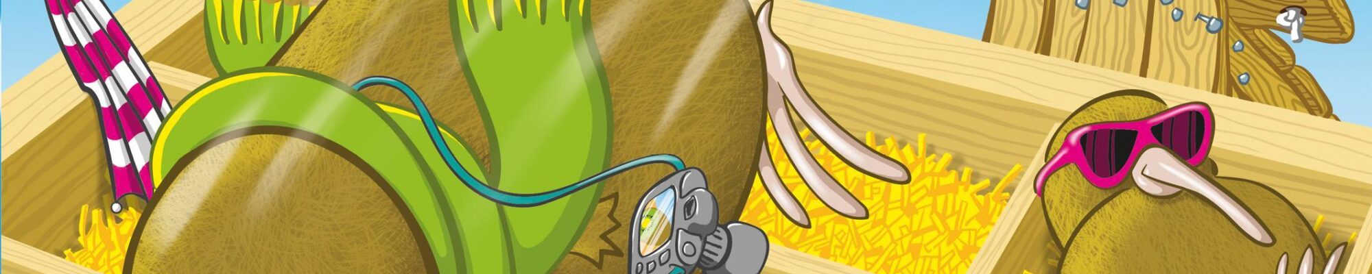 Bei dem Actionspiel Flying Kiwis von Huch geht es heiß her. Wie gerne würden die kleinen Kiwis mal außerhalb von Neuseeland Urlaub machen. Ist aber ja gar nicht so einfach wenn man ein Vogel ist, aber nicht fliegen kann. Um dem zu entgehen, schmuggeln die Kiwis sich in Obstkisten und werden als Kiwis in die ganze Welt exportiert. Die Mitspieler helfen den Kiwis dabei die besten Plätze zu ergattern. Denn mit einer Rampe fliegen die Kiwis auf das Spielfeld und versuchen die schon liegenden Plättchen zu überdecken. Da die Kiwis gerne in Vierer Gruppen sitzen, versucht sie immer zu viert zusammen zu bekommen. Gewonnen hat der Spieler mit den meisten Punkten.