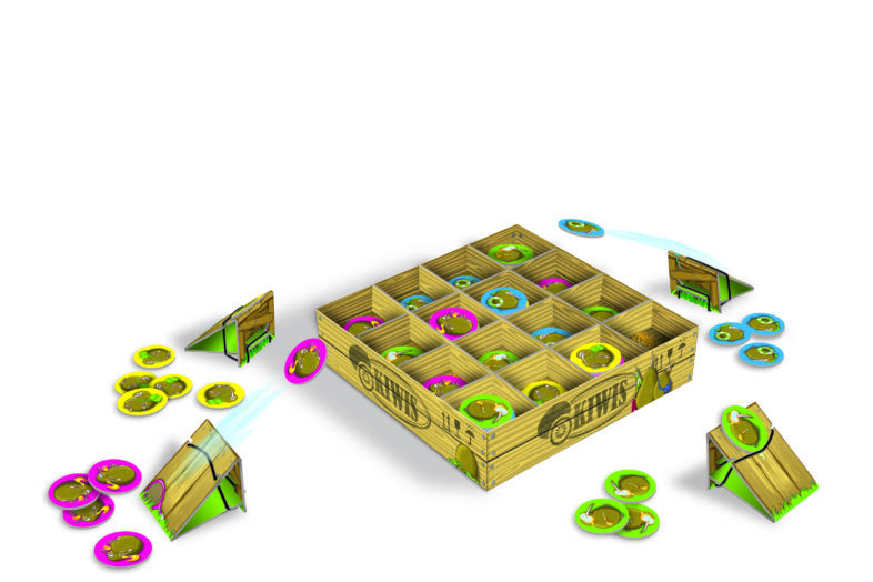 Vor jeden Mitspieler wird eine Rampe aufgestellt und er bekommt zehn Kiwis in seiner Farbe. Am besten übt man vor dem ersten Spiel das Schnippen der Kiwis ein wenig. Dann legt man eine Kiwi auf die Rampe und zieht mit der Fingerkuppe den Gummi leicht nach unten. Beim los lassen fliegt die Kiwi dann im besten Fall in die Kiwi Kiste.