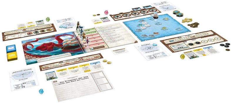 • Je 1 Spielanleitung, Ortsbuch, Karten-Spielplan, Bootsmann-Tableau, Erster-Offizier-Tableau, Proviantmeister-Tableau, Kannonier-Tableau, Quartiermeister-Tableau, Block mit Schiffslogbuchbögen und Spielerbögen