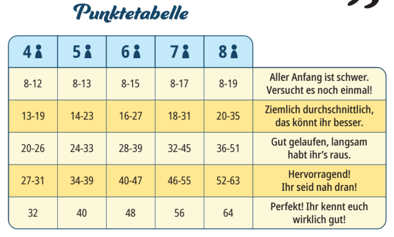 Das Spiel endet, wenn Ihr acht verschiedene Karten durchgespielt habt. Die Gesamtpunktzahl, die Ihr bei einer Partie „Fun Facts“ erworben habt, könnt Ihr in der Punkteliste eintragen. Anhand der Punktetabelle könnt Ihr schauen, wie gut Ihr als Team gewesen seid. Der Reiz des Spiels ist es, sich mit der nächsten Runde zu verbessern.