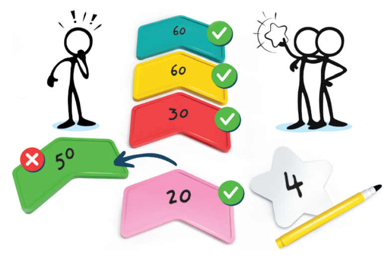 Nachdem Ihr alle Eure Pfeile platziert habt, kommt die letzte Phase namens „Aufdecken“. Nun beginnt Ihr mit dem niedrigsten Pfeil und deckt diesen auf. So arbeitet Ihr euch dann ganz nach oben. Wenn Ihr dabei Pfeile entdeckt, die falsch platziert wurden und demnach nicht in eine aufsteigende Zahlenreihe passen, sortiert Ihr diese aus. Gleiche Zahlen, die aufeinander folgen gelten hierbei als richtig. Jeder Pfeil, der richtig platziert wurde, ergibt für euch als Gruppe einen Punkt. Die Punkte, die in dieser Runde entstanden sind, werden zusammengezählt und auf den Start-Stern geschrieben.