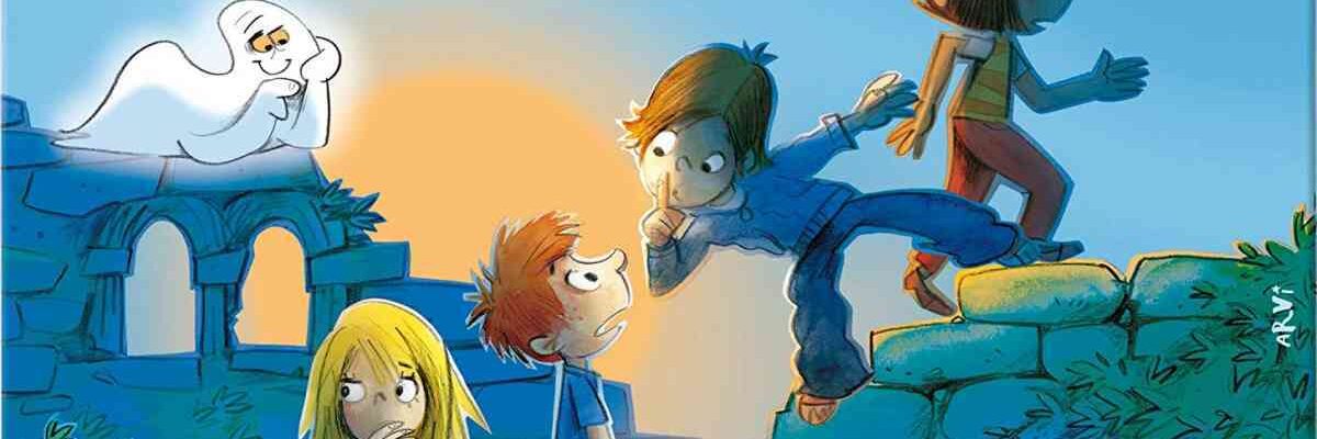 Zuerst beklebt ihr die Unterseiten der vier Geister mit jeweils einem der farbigen Klebepunkt. Jetzt hat jede der Spukgestalten eine eigene Farbe, die man jedoch während des Spielens nicht sieht. Jetzt legt ihr den Spielplan für alle gut erreichbar in die Tischmitte. Jeder Spieler sucht sich eine der farbigen Scheiben aus und legt sie auf die unterste Treppe des Plans. Die Geister braucht ihr am Anfang noch nicht. Stellt sie neben dem Spielplan bereit.