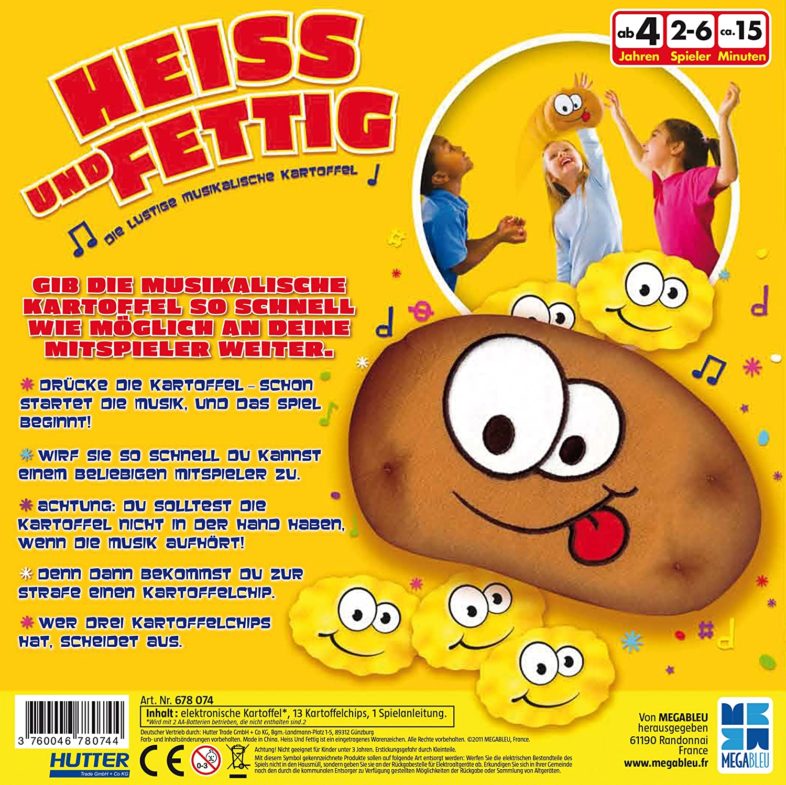 Das lustige Reaktionsspiel Heiss und Fettig von Megableu bring Stimmung in die Bude. Denn wenn man die heiße Kartoffel drückt, dann startet eine Musik und das Spiel kann beginnen. Jetzt versucht jeder die heisse, fettige und fliegende Kartoffel zu fangen und dann weiter zu werfen. Hat die Musik aufgehört zu spielen, dann bekommt der Spieler den Kartoffelchip, der die Kartoffel als letztes in den Händen hält. Wenn man drei Kartoffelchips gesammelt hat, dann scheidet man aus dem Spiel aus.