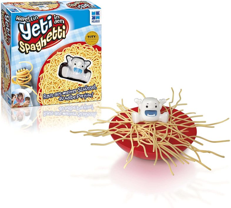 Das witzige Geschicklichkeitsspiel „Hilfe! Ein Yeti in den Spaghetti“ von Megableu verlangt von allen viel Konzentration. Das verrückte Familienspiel, bei dem ein Yeti auf einem Spaghetti Berg sitzt und nicht in die Schüssel fallen darf. Wie bei Mikado auch, stibitzt man immer einen Stab, in diesem Fall eine Spaghetti unter dem Po vom Yeti weg. Aber aufgepasst, denn wenn man den Yeti in die Schüssel fallen lässt, dann hat man verloren.