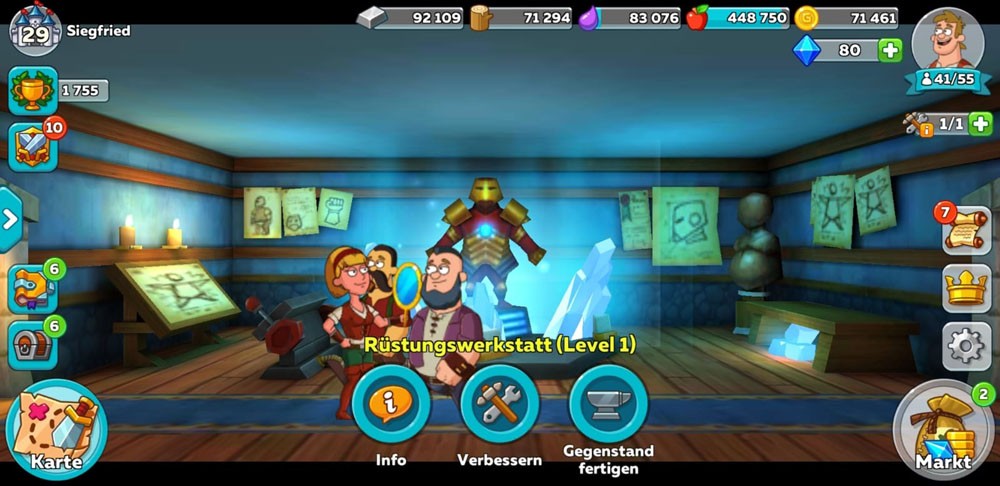 In diesem Sinne sollten Sie als Erstes Ihre vorhandenen Räume aufrüsten, insbesondere den Speisesaal und die Schatzkammer, die Sie im Lernprogramm erstellt haben. Durch die sofortige Aufrüstung dieser beiden Räume optimieren Sie Ihren Gold- und Nahrungszufluss. Um neue Räume zu bauen, müssen Sie nur auf den Markt gehen und, solange Sie genug Gold haben, einfach auf den gewünschten Raum klicken und ihn auf einen der freien Plätze Ihres Schlosses setzen. Wenn die Produktion beginnt, können Sie jederzeit auf die Schaltfläche „Beschleunigen“ klicken. So können Sie die Bauzeit erheblich verkürzen, allerdings kostet es immer eine Menge anderer Ressourcen.