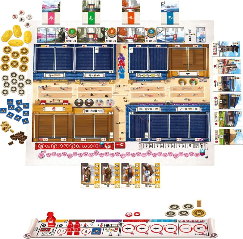 Zum Schluss müsst ihr die noch übrigen Münzen, Sandalenplättchen, Reisballen, Koban- und Bauholzsteine neben das Spielbrett legen. Diese Sachen befinden sich quasi in der Bank. In Iki wird es Bugyo-sho genannt und stellt das Büro der Stadtverwaltung dar.
