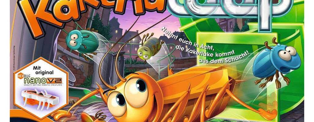 Aus den Spielen der Kakerlakak-Familie von Ravensburger gibt es diesmal das lustige und spannende Spiel Kakerlaloop. Wer schafft es, seine Käfer vor der Kakerlake zu schützen? Diese greift nämlich über zwei Loopings die Spielfläche an. Zieht so schnell wie möglich und ohne euch erwischen zu lassen, mit euren Käfern zu den sicheren Gittern.