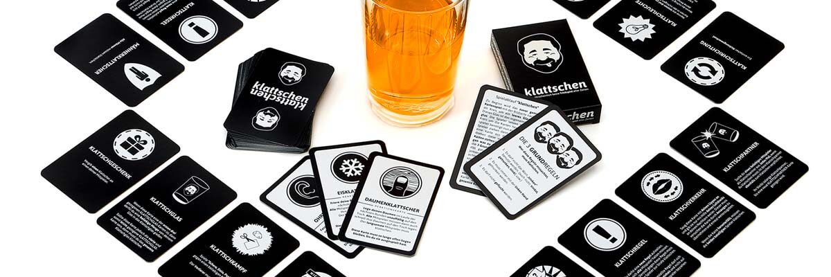 Klattschen ist ein populäres Trinkspiel mit Karten, bei dem die Spieler verschiedene Aufgaben und Herausforderungen erfüllen müssen, die auf den gezogenen Karten beschrieben sind.