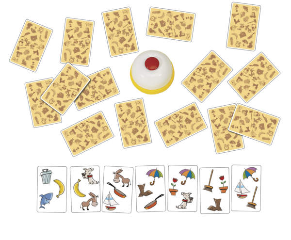 Bei diesem Spiel gibt der jüngste Spieler das Startsignal. Das könnte so aussehen, dass er zum Beispiel auf die Glocke haut. Alle Spieler starten jetzt gleichzeitig und ziehen eine Karte nach der anderen aus dem gemischten Stoß. Passt die Karte zu meiner anderen Karte mit einem gleichen Symbol, dann legt man sie an. Passt kein Symbol überein, dann legt man die Karte einfach wieder in die Mitte zurück und zieht die nächste.