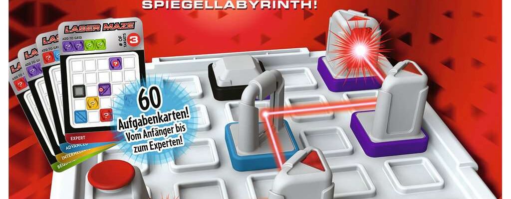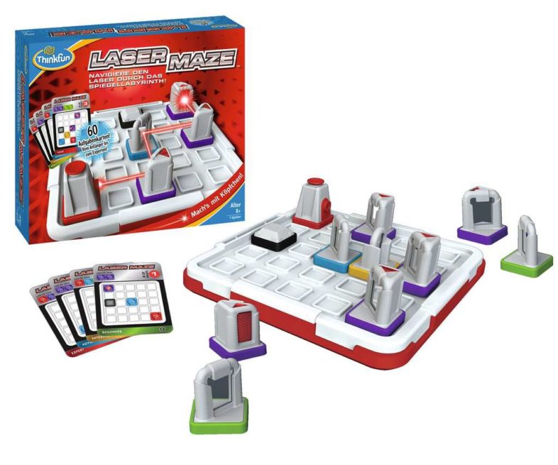 Für das Spiel Laser Maze von Ravensburger ist viel logisches Geschick gefragt. Wichtig ist zu wissen wo der Eintritts- und Austrittswinkel bei den Spiegeln ist um das Spiel zu gewinnen. Ziel ist es, beim Start den Laser so zu lenken, dass er das Ziel erreicht und der Zielstein rot leuchtet. Es gilt hier 60 verschiedene Aufgabenkarten zu gewinnen. Nicht nur die Zielsteine bringt man hier zum Leuchten sondern auch die Augen des Spielers.