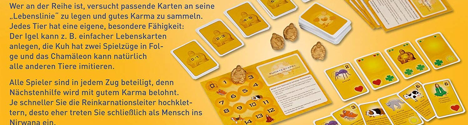Stell dir vor, dein Leben als Mensch ist zu Ende und du wirst als Ameise wiedergeboren. Um das Nirwana zu erreichen, musst du dich Stufe für Stufe „hochsterben“. Ziel des Spieles Mieses Karma ist es, wieder Mensch zu werden und als solcher zu sterben. Das Kartenspiel wurde nach dem gleichnamigen Buch von David Safier entwickelt.Spielanleitung kostenlos als PDF downloaden Spielanleitung kostenlos als PDF downloaden