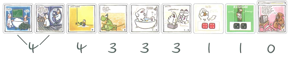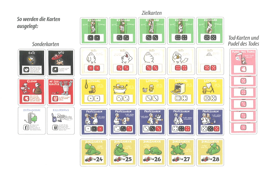 Wollt ihr bestimmte Karten euer Eigen nennen, so müsst ihr mit den Würfeln die richtigen Ergebnisse erzielen. Beispielsweise bentigt ihr das jeweils abgebildete Würfelpärchen, um Herrn Riebmann, Yetis oder Lemminge zu bekommen. Wer beispielsweise einen Dinosaurer haben möchte, benötigt hohe Würfelsummen und den Pudel des Todes gibts dagegen für einen rosafarbenen Würfel.