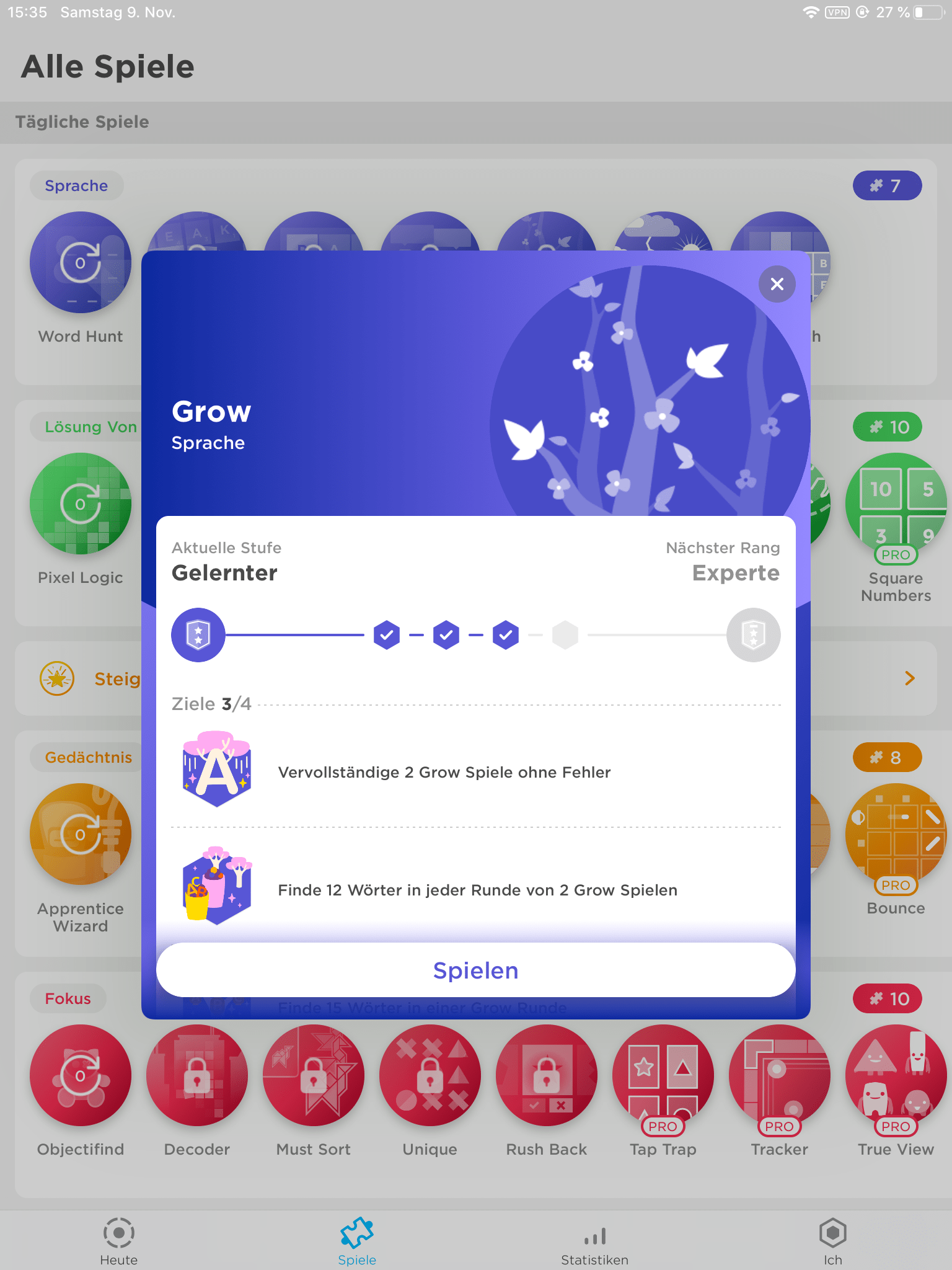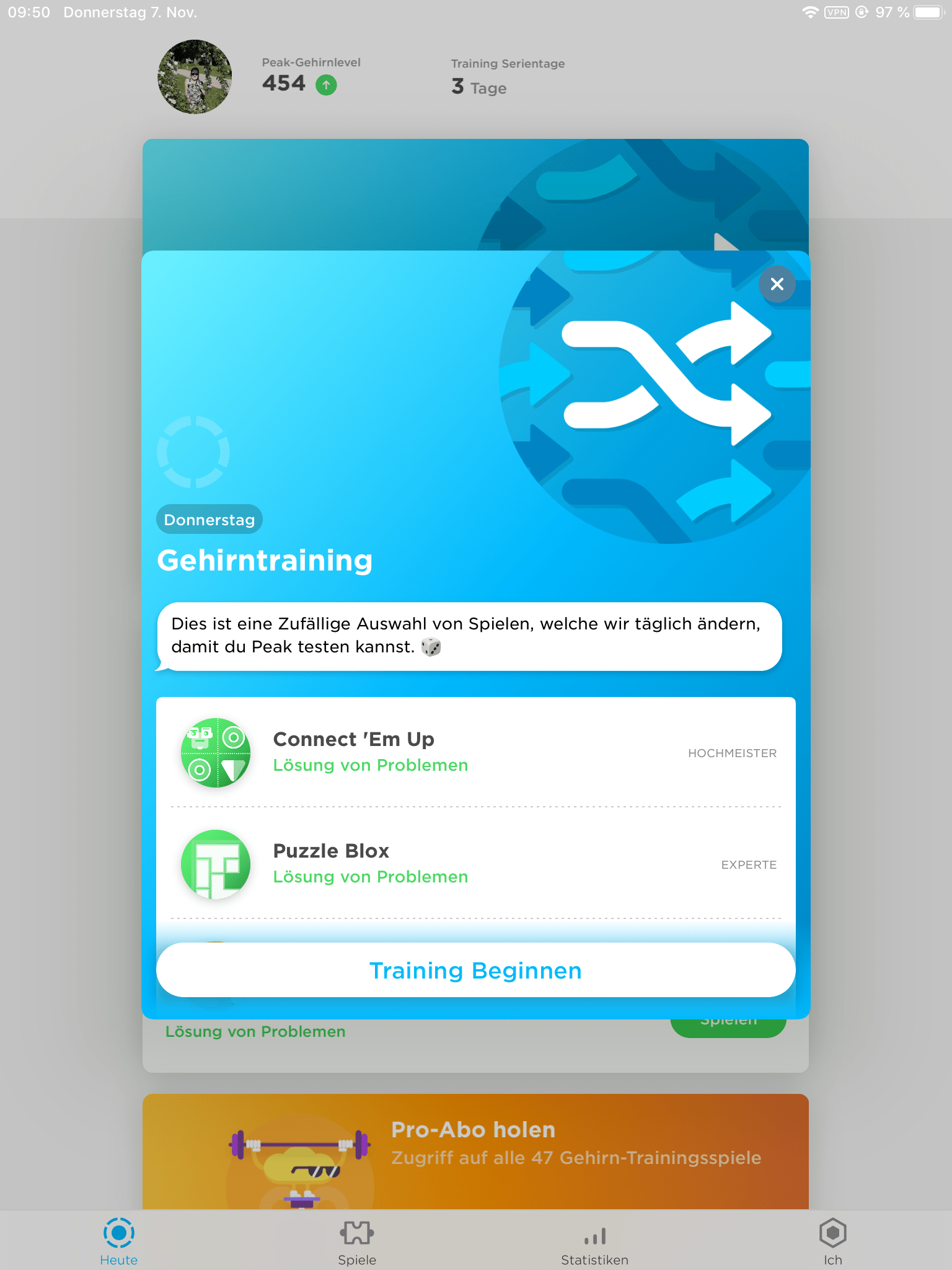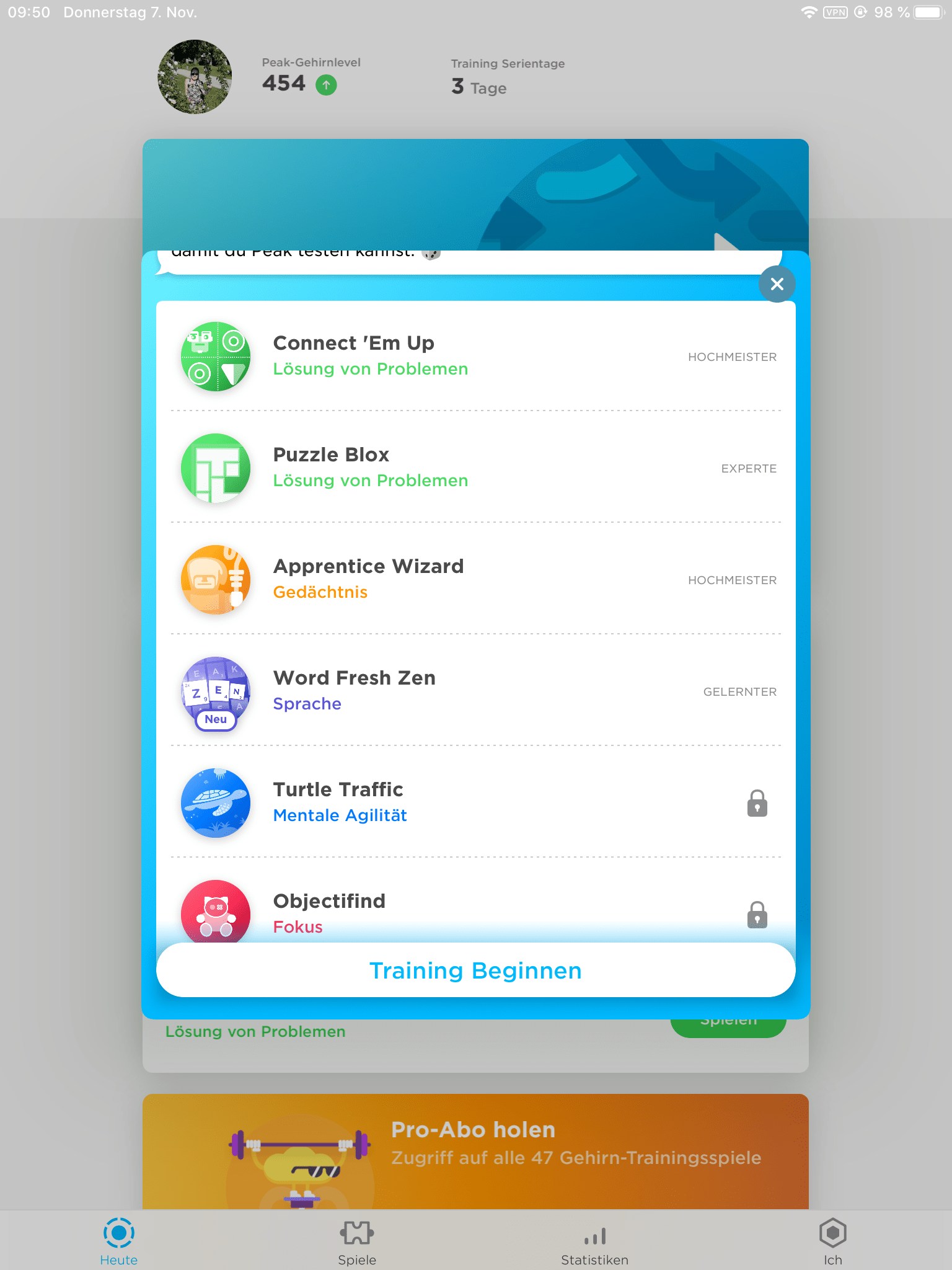 Die App empfiehlt, jeden Tag die vorgeschlagenen Spiele zu spielen um ein optimales Trainingsergebnis zu erzielen.