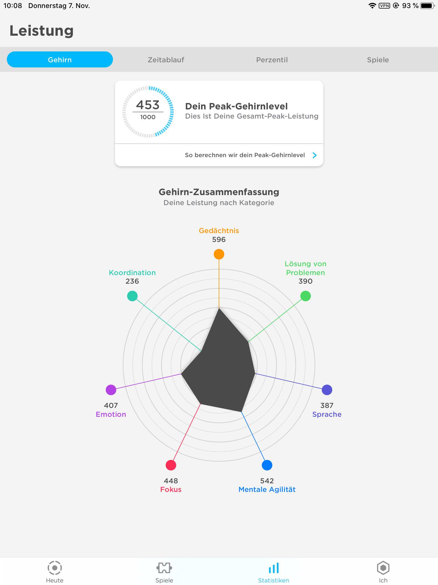 Keine Gehirntrainingsapp kommt ohne eine anschließende Auswertung daher. Peak zeigt dir deinen Fortschritt anhand des Peak-Gehirnlevels. Dieser wird anhand des gesamten Durchschnitts einer Kategorie (alle Spiele, die in diese Kategorie jemals gespielt wurden) errechnet.