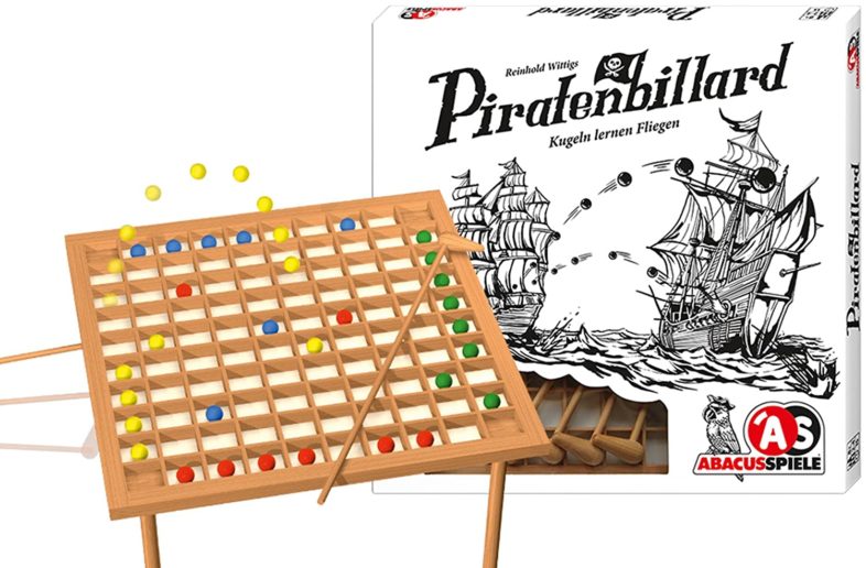 Dieses Action geladene Geschicklichkeitsspiel Piratenbillard von Abacusspiele lässt den Puls der Spieler rasen. Die Mannschaft ist am meutern und möchten einen neuen Kapitän. Wer von den Spielern schafft es diese Führungsposition zu übernehmen und den Respekt der Mannschaft zu verdienen? Der große Holzrahmen ist in Fächer unterteilt und unten mit einem Leinentuch bespannt. Die Spieler schlagen von unten mit einem Holzqueues gegen ihre Kugeln und bringen diese dadurch zum vorwärts kommen. Gewonnen hat das Spiel wer es schafft sieben oder mehr Punkte als erstes zu erreichen.