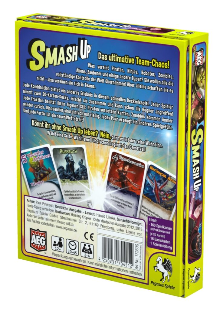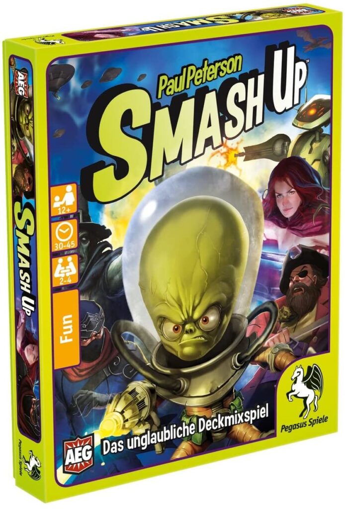 Beim Kartenspiel Smash Up von Pegasus Spiele kämpfen die verrücktesten Spezies gegeneinander. Zu den Spezies gehören zum Beispiel Ninjas, Zombies, Zauberer, Aliens, Piraten, Roboter und viele andere. Natürlich hat jeder dieser Kreaturen seine eigenen unfairen Mittel zu kämpfen. Zu Beginn entscheidet sich jeder Mitspieler für eine Spezies und sammelt so viele Punkte wie möglich. Gewonnen hat der Spieler, der zuerst 15 Siegpunkte erreicht hat.