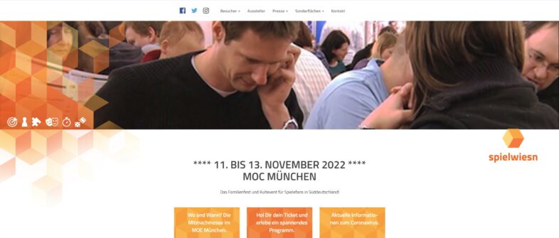 Von 11. bis 13. November 2022 findet die Spielwiesn im MOC München statt. Es handelt sich um eine Mitmachmesse und ist ein regelrechtes Kult-Event, bei dem allen Spielbegeisterten die neuesten Brettspiele und Gesellschaftsspiele vorgestellt werden.