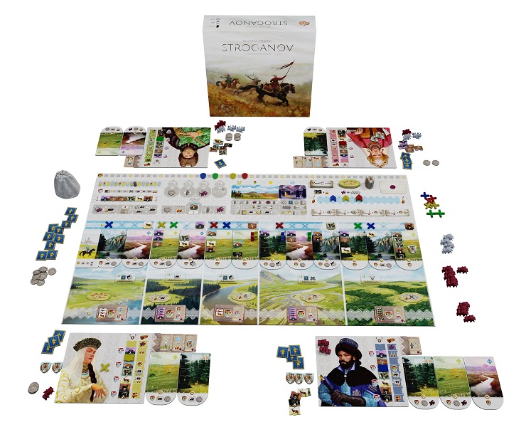 Das Brettspiel Stroganov ist ein attraktives Spiel. In ihm spielt man die Mitglieder der russischen Familie Stroganov und hat die Aufgabe das russische Reich zu kaufen. In den 12 Landschaftsplättchen platziert man seine eigenen Kosaken und kann dort agieren. Durch den Handel mit Fellen steigt der Einfluss und das Geld und dadurch hat man die Möglichkeit mehr Landschaften zu kaufen und seine Ressourcen zu erreichen. Und auch nur so ist es möglich, dass man den Wünschen des Zaren nachkommen kann. Für die Erfüllung der Wünsche erhält man natürlich weitere Siegpunkte und Privilegien.