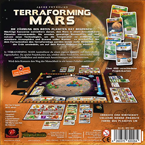 Erobert im anspruchsvollen Strategiespiel Terraforming Mars mit eurem Konzern den roten Planeten, denn ihr baut ihn aus, damit er für die Menschheit bewohnbar wird. Erschafft mit eurem Projekt das passende Klima auf dem Mars, weil dann ist die ersten Menschen von unserem Planeten Erde dorthin umsiedeln können. Neueste Technologien helfen euch, die Sauerstoff-Konzentration in der Atmosphäre zu verändern, die Temperatur auf ein annehmbares Level zu bringen und Ozeane für die Wasserversorgung zu bilden. Schließlich geht der Konzern, der es als Erster schafft eine der Erde ähnliche Atmosphäre zu erschaffen, als Sieger des spannenden Spiels hervor. Bedenkt eure Projekte gut, denn im Wettstreit um das lebenwiedrige Terrain geht es Ruhm und Ehre.
