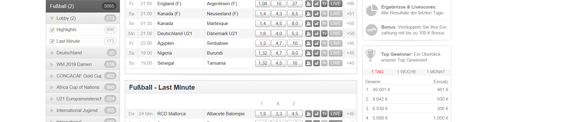 Links stehen verschiedene Sportarten, auf die man Wetten kann. Wenn ihr eine Wette eingegeben habt, findet ihr diese wieder im Wettschein, welcher euch oben rechts angezeigt wird.