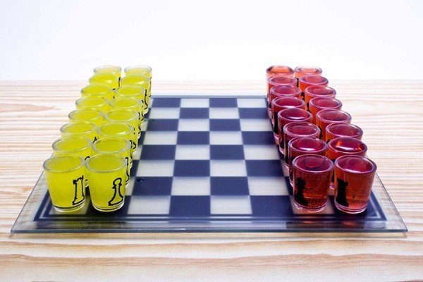 Trink Schach wird hier nach den üblichen Schachregeln gespielt. Der Unterscheid dabei ist, dass man das Glas leer trinken muss, sobald man geschlagen ist. Da kann es natürlich vorkommen, dass man versucht viele Bauern des Gegners zu schlagen um seine Konzentration zu schwächen. Das hat auch viel mit Taktik zu tun.