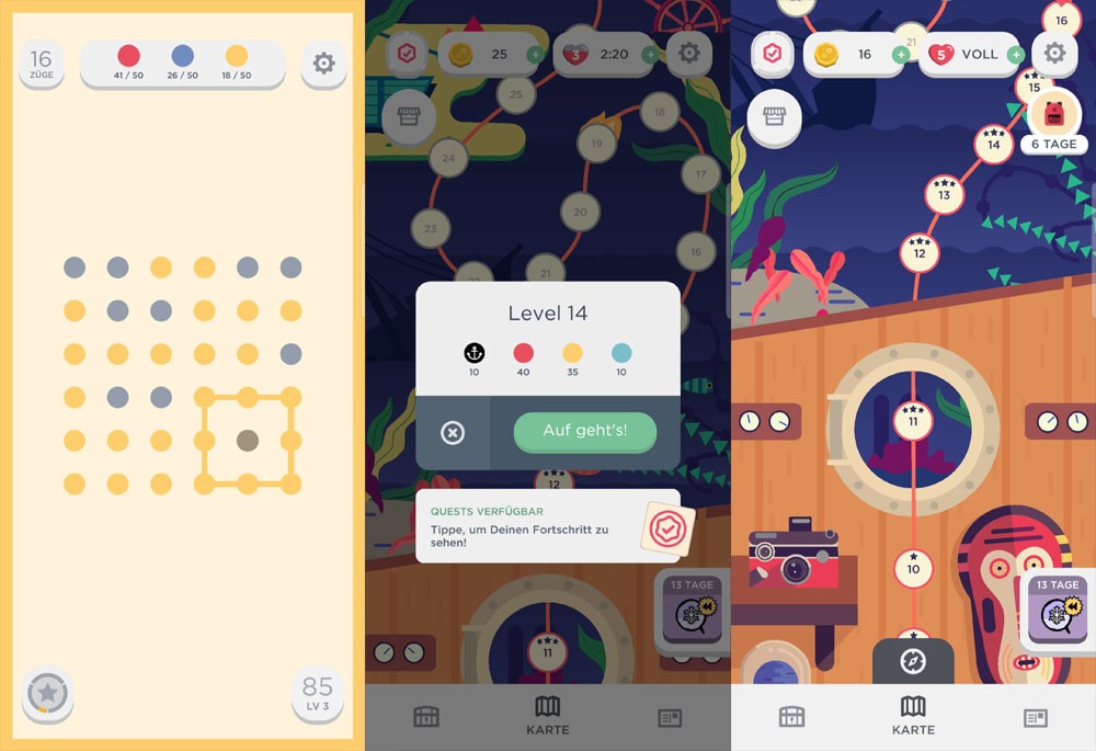 Mit der Zeit kommen außerdem auch weitere Levelwelten hinzu, bei denen dann zum Beispiel Punkte mit Ankersymbolen anstelle von Farben – oder zusätzlich dazu – zum Boden des Spielfelds bewegt werden müssen. Außerdem gibt es tägliche Quests und viele verschiedene Zwischenevents, die sich nach einer bestimmten Saison richten. Weihnachten zum Beispiel.