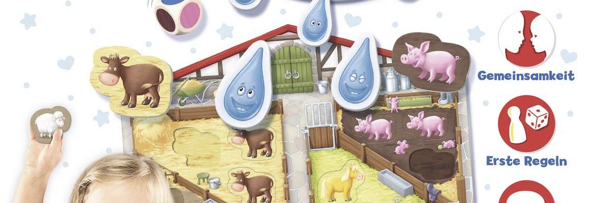 Das Spiel Unser Bauernhof von Ravensburger richtet sich zwar in erster Linie an die ganz Kleinen, kann aber durch einen Fortgeschrittenenmodus auch von etwas älteren Kindern gespielt werden. Dem Spiel liegt die Geschichte zugrunde, dass eine finstere Regenwolke aufzieht und die Tiere vom Bauernhof (Kühe, Pferde, Schafe und Schweine – es ist alles dabei) schnell in Schutz gebracht werden müssen.