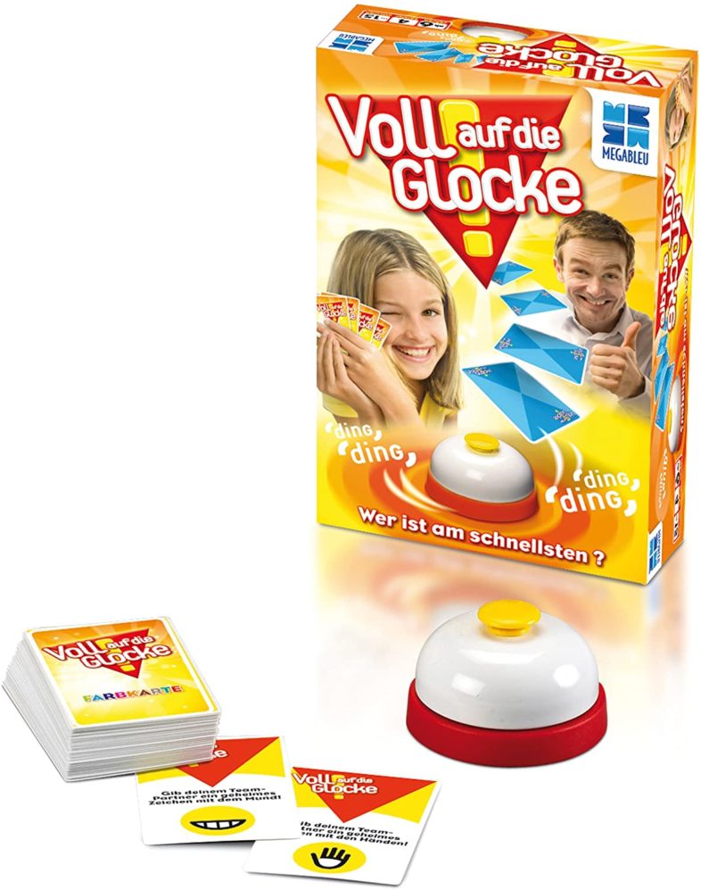 Für das Kartenspiel Voll auf die Glocke von Megableu sind gutes beobachten und eine schnelle Reaktion erforderlich. Es wird zu viert in je zwei zweier Teams gespielt. Vier Farbkarten in gleicher Farbe zu sammeln und dann dem Teammitglied mitteilen durch geheime Zeichen dass er Voll auf die Glocke schlagen kann ist das Ziel. Die Teams sitzen sich beim Spiel immer gegenüber. Bevor man mit dem Spielen beginnt, entscheidet man sich für eine bestimmte Anzahl an Runden. Aber Vorsicht, denn wenn das gegnerische Team den Braten riecht, dann kann es schnell die Punkte wegschnappen.